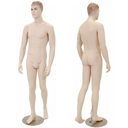 Fiberglass male mannequin with makeup, molded hair, metal base. Detachable arms, hands and torso make them easy to dress. Color: flesh tone.